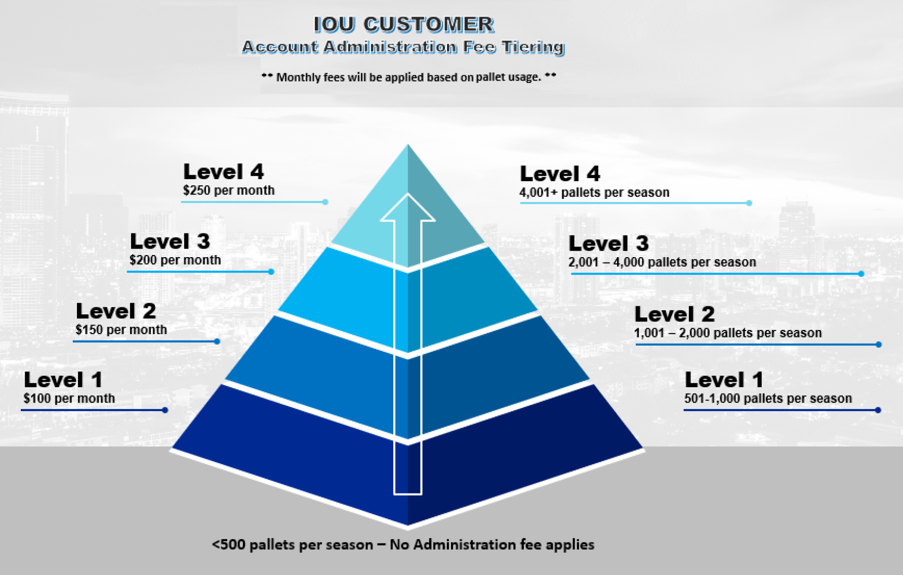 - An administration fee for pallet handling will apply to all IOU accounts issued 500+ pallets in a season, the fee charged is applied using a tiering system. Refer to the tiering pyramid pictured below for applicable fees.